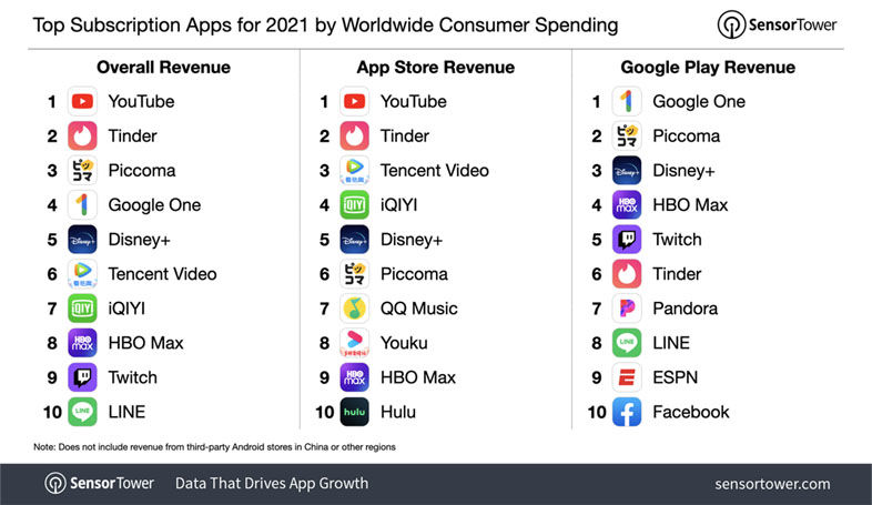 اپلیکیشن یوتیوب در ایالات متحده و سایر نقاط جهان، برترین برنامه سرویسهای اشتراک در اپاستور بوده است. مجموع درآمد سرویس اشتراکی این اپلیکیشن در سراسر جهان 1.2 میلیارد دلار بوده که 566.5 میلیون دلار آن از کاربران ایالات متحده به دست آمده است. اپلیکیشن Tinder هم دومین برنامه محبوب اشتراکی در سال 2021 بوده است.