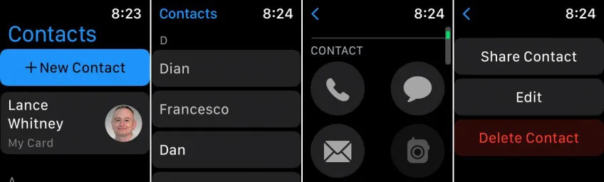 اپل با اضافه کرن اپلیکیشن Contacts به watchOS 8، امکان ویرایش و مدیریت تماسهای کاربر از طریق اپلواچ را امکانپذیر کرد. برای نمایش نام، آدرس، شماره تلفن شخص روی کارت مربوط به تماس آن ضربه بزنید. با آیکنهای بالای کارت، امکان برقراری تماس تلفنی و ارسال پیام متنی وجود دارد؛ همچنین میتوانید به شخص دلخواه ایمیل بزنید. علاوهبراین با ضربه زدن به قسمت پائین میتوانید اطلاعات تماس را با شخص دیگری به اشتراک بگذارید.