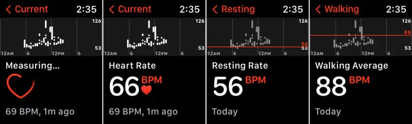 به کمک اپلیکیشن Heart Rate، امکان بررسی ضربان قلبتان در هر زمانی وجود دارد؛ با بازکردن اپلیکیشن، ضربان قلب فعلی شما اندازهگیری شده و بهنمایش گذاشته میشود. تا وقتی اپلواچ در حالت نمایشگر (display mode) باشد یا به صفحهنمایش نگاه کنید، اپلیکیشن بهصورت دورهای ضربان قلب شما را ضبط میکند. با لمس فلش در قسمت بالای سمت چپ، اپلیکیشن ضربان قلب فعلی، ضربان قلب در حالت استراحت، ضربان قلب میانگین و ضربان قلب براساس فعالیتهای مختلف را نمایش میدهد. برنامههای کاملتر و بهتری هم برای ثبت و نمایش ضربان قلب وجود دارند که امکان استفاده از آنها در اپلواچ وجود دارد. اگر علاقهای به اپلیکیشن Heart Rate ندارید، میتوانید از اپلیکیشنهای جایگزین مثل Cardiogram، Heart Analyzer، HeartWatch و Talking Heart Rate استفاده کنید.
